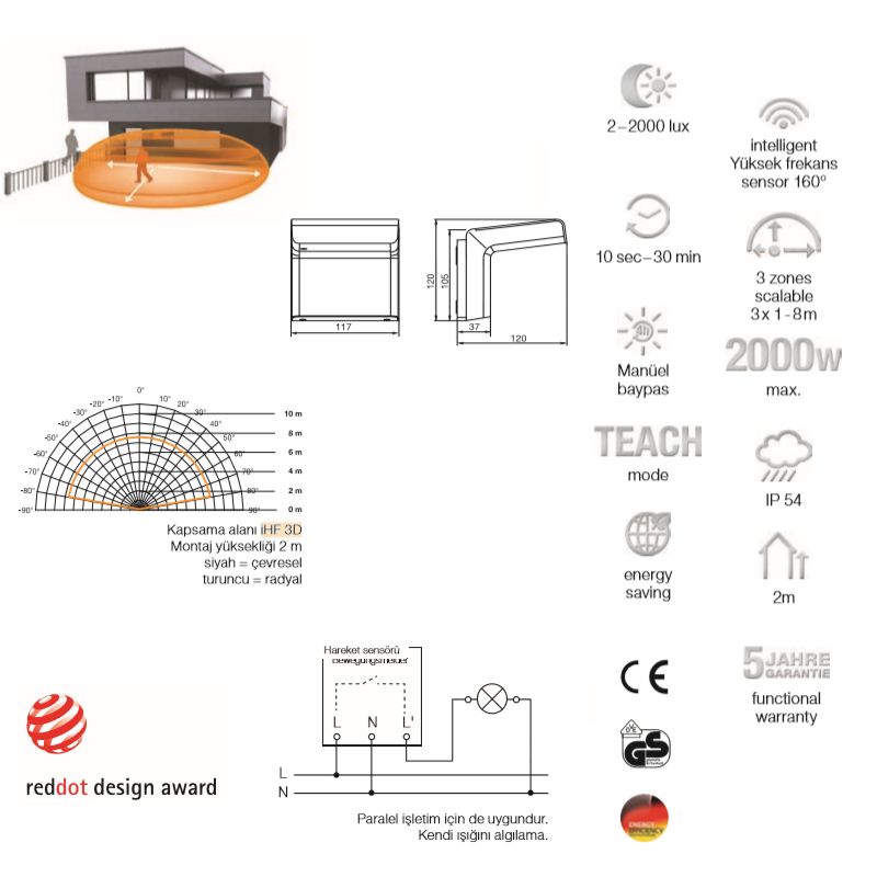 Aksamadan, tavizsiz, kusursuz. iHF 3D, dış mekan için mükemmel hareket sensörüdür. İster cephelerde, ister yanları açık garajlarda, teraslarda veya otoparklarda – akıllı yüksek frekans sensörü ışığı ancak olması gerektiği yerde açar. Bir taraftan, insan hareketlerini çalıların, küçük hayvanların hareketinden ve yağmurdan ayırd etmesiyle. Diğer yandan, kullanıcının azami 7 metrelik algılama yarıçapını üç boyutta da kendi gereksinimlerine uygun şekilde hassas olarak ayarlayabilmesiyle. Üstelik her türlü hava koşulunda.